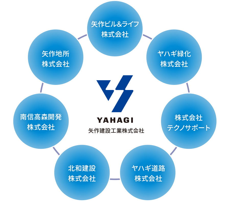 矢作建設グループは、矢作建設工業株式会社を中心に、分譲マンション事業、不動産事業、緑化事業などを展開する7社の会社で構成。各分野に精通したグループ企業の専門的なノウハウと、矢作ビル&ライフが長年培ってきたノウハウをもって、建物の新たな価値を生み出していきます。