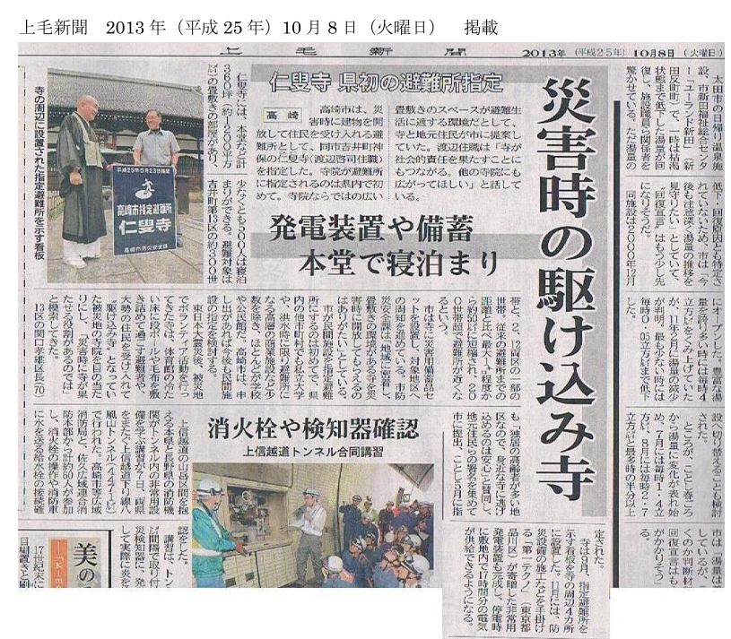 お寺が自治体に申し出て指定避難所に認定されたという記事です。