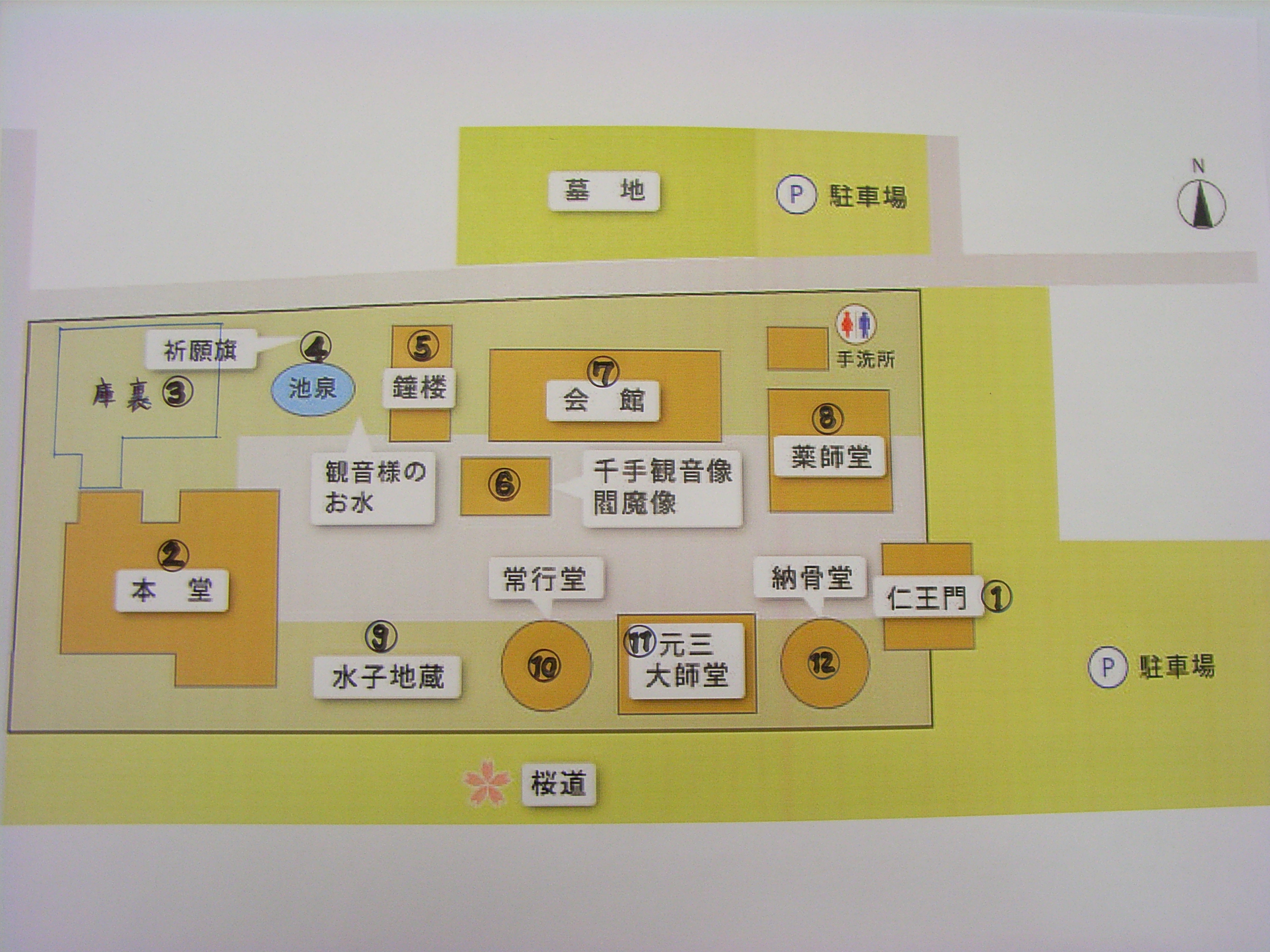 寺の配置は、東入口の①仁王門をくぐると正面奥に②本堂(ご本尊:十一面観世音菩薩)